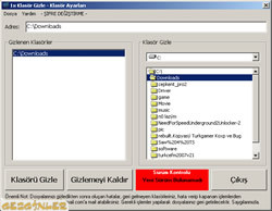 yani programa girerek yönetici girişinden sonra klasörlerinizi tekrar görünür hale getirmediğiniz sürece klasörlerinizi siz bile göremezsiniz.Programın kullanımı çok basit. Yönetici girişinden sonra dizinlerde gezin ve gizlenmesini istediğiniz klasörleri seçerek "Klasörü Gizle" düğmesine tıklayın
